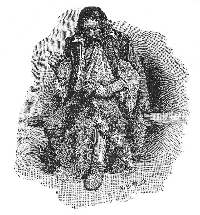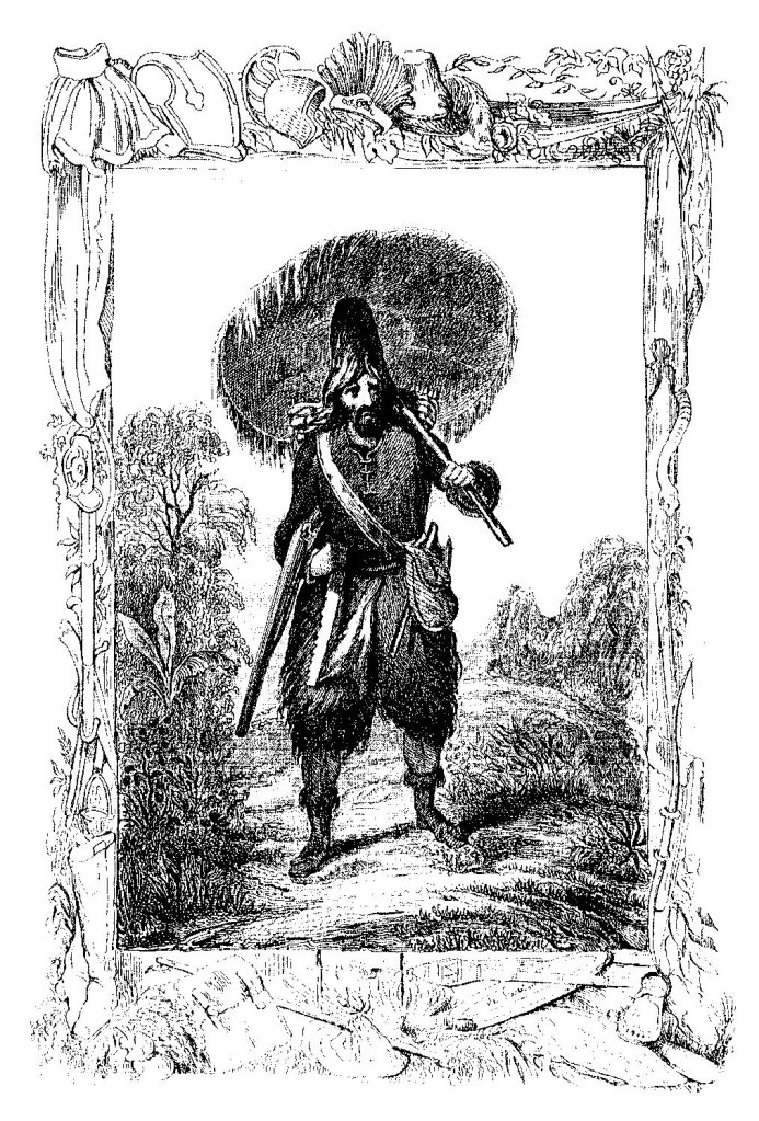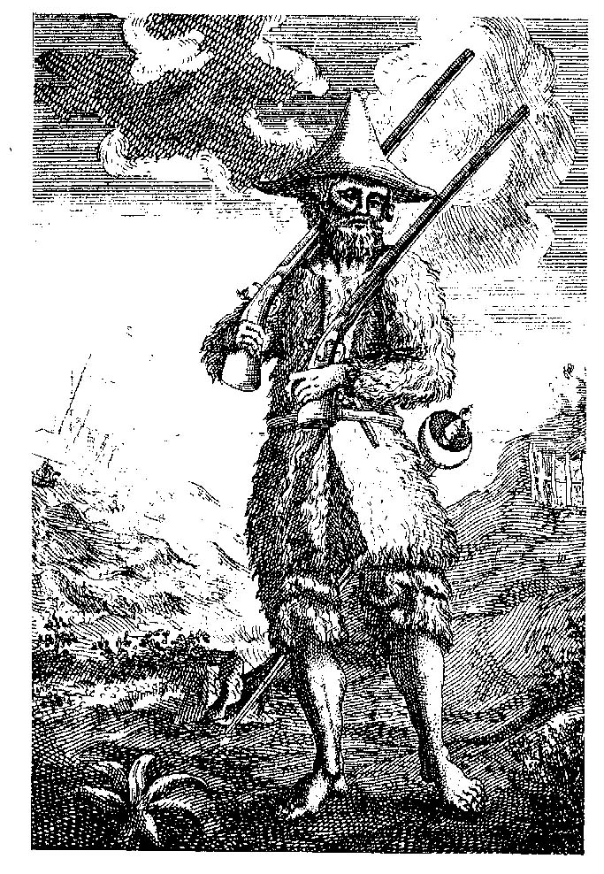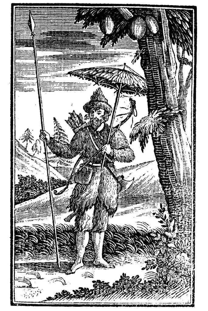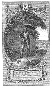 John Clark e John Pine propongono un’illustrazione vitale, caratterizzata da una struttura iconografica durevole nel tempo in cui, «la collocazione del protagonista al centro, fra i singoli episodi posti in scene laterali, conferma la convenzione raffigurativa della simultaneità»[2]. Nella prima edizione in lingua francese del Robinson Crusoe (1720) ritroviamo un ritratto del naufrago nel frontespizio, firmato da Bernard Picart (1673-1733), il quale propone una grafica cavalleresca e di culto con riferimento all’iconografia dell’omo silvatico.