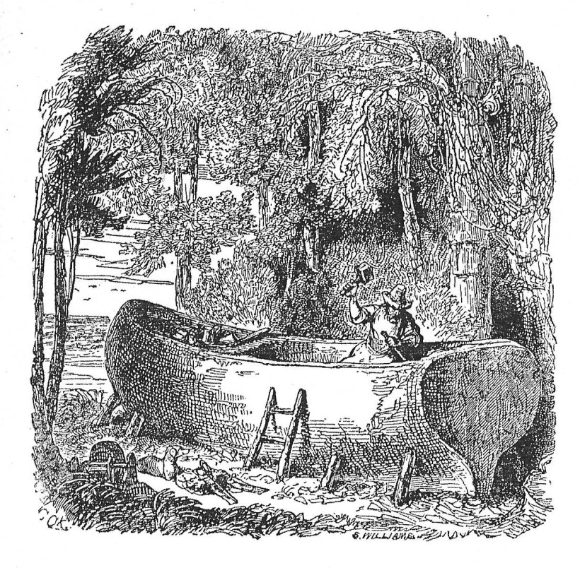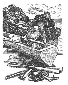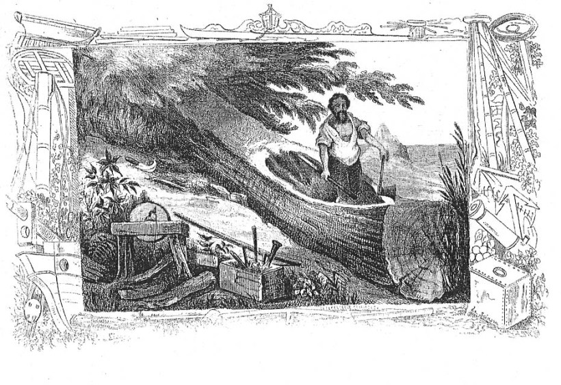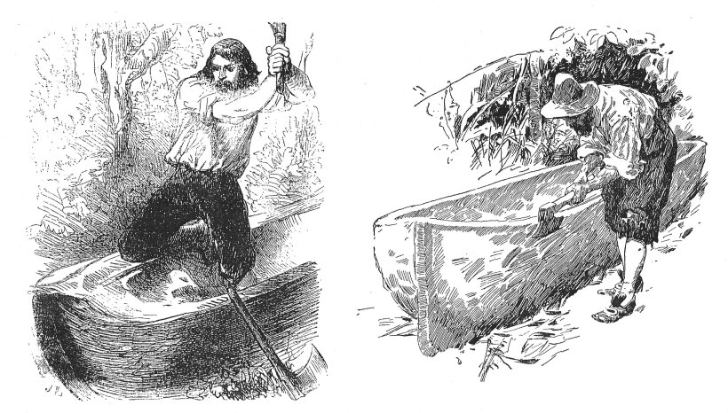 Dopo essere stata esplorata, l’isola si tramuterà in una prigione, aggirabile soltanto attraverso la fuga; di qui la costruzione della barca, concretizzatasi in una progressione di un appassionante montaggio: «da tronco a imbarcazione dalla chiglia e dai fianchi sagomati, immagine alla quale si ispira l’insieme delle illustrazioni, che descrivono i tre momenti distinti del lavoro, della pausa di riflessione e del varo»[8]. Emerge qui l’abilità di Janet Lange (1815-1872), Walter Zweigle, George Cruikshank, Riccardo Salvadori (1866-1927), Louis de Sainson e Renato Guttuso (1912-1987).