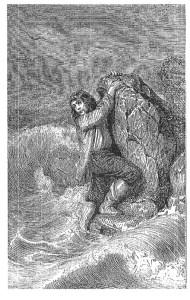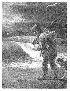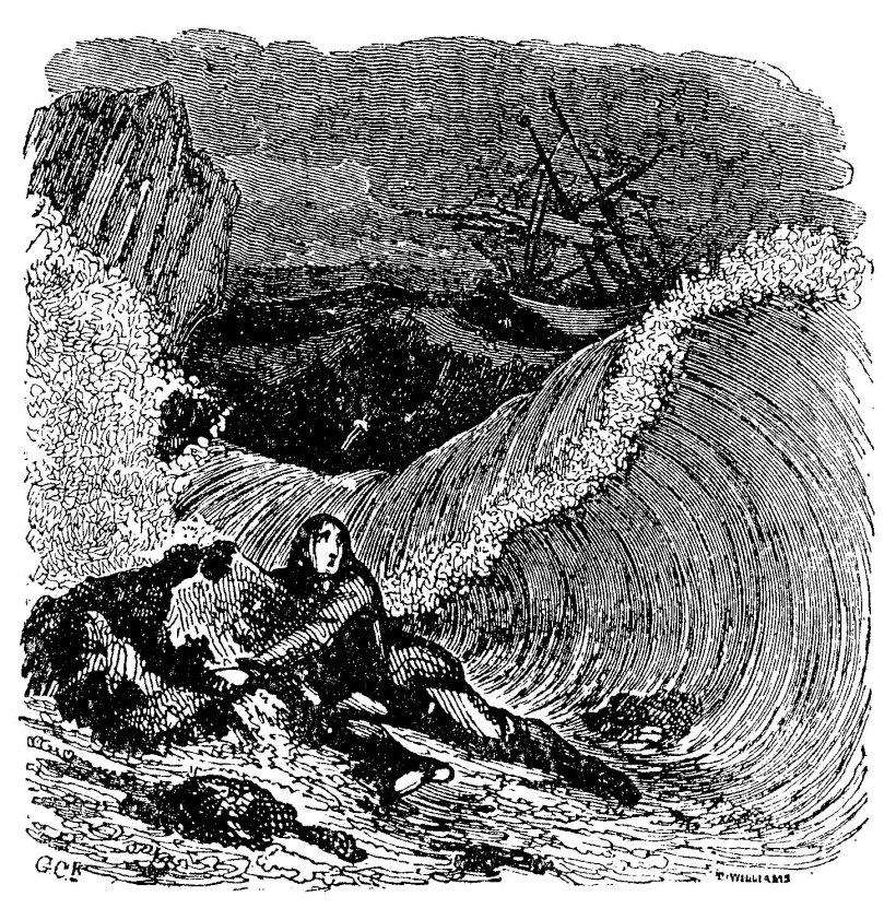 A seguire, di particolare importanza il naufragio, fase critica da un punto di vista individuale (la perdita dello status borghese e il passaggio ad una condizione del tutto selvaggia) e decisamente rivelatrice nell’illustrazione, clamorosamente apprezzata in era romantica; l’eroe di Defoe, «precariamente abbarbicato a una scheggia di scoglio come lo vuole la maggior parte delle immagini, inerme e sopraffatto nel momento immediatamente successivo alla salvezza»[4], diventa protagonista delle sequenze più ricche e suggestive nelle quali scorgiamo ora un richiamo alla pittura di genere, ora un tributo a L’onda di Hokusai (George Cruikshank, [1792-1878], edizione 1783 e Louis de Sainson), ora un trionfo romantico nelle edizioni neoclassiche del 1808 e 1810, nelle quali si nota la sublime teatralità della posa assunta dal naufrago aggrappandosi allo scoglio (Thomas Nicholson e Karl Girardet).