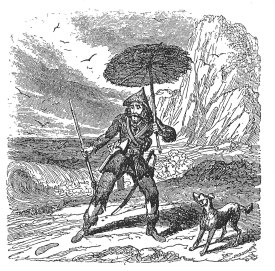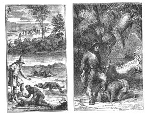 L’incontro con Venerdì, sequenza privilegiata dagli illustratori, è caratterizzata da quattro diversi segmenti narrativi: il primo si riferisce al terrore di Venerdì all’apparizione di Robinson, una sequenza illustrata da Jean Grandville (1803-1897) e Paul Gavarni; nel secondo vi è in primo piano l’omaggio delle armi e della testa mozzata al nemico, descritto da Richard Corbould (1757-1831) e James Allen; nel terzo vediamo l’atto di sottomissione con il quale Venerdì si pone sul capo il piede di Robinson, presente nelle incisioni di Bernard Picart (1673-1733), di Karl Girardet e di Pierre Mariller (1740-1808); infine, la quarta fase si concentra sul conforto di Robinson rivolto a Venerdì, rilevabile dalle incisioni anonime di edizioni del 1783, del 1808 e del 1813. In ognuna di queste raffigurazioni ritroviamo un Venerdì domestico e confidente, figlio e suddito, volto a soddisfare le aspirazioni del suo padre-padrone[11].