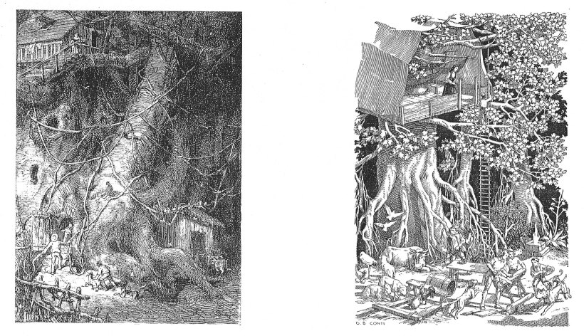 Nell’ultima delle nove fasi illustrate, la casa sull’albero, non possiamo non menzionare Sonzogno; come Paravia (1916) ed Hoepli (1880), anch’essa, nel 1818, pubblicò il romanzo dando risalto a quello che dalle illustrazioni emerge come un albero della vita, carico di profondità inconscia e spirito d’avventura. Troveremo anche qui un approccio poliedrico dei vari illustratori: avremo una sorta di “crocifissione” simulata con Walter Zweigle, un mesto abbandono alla natura con Ludwig Richter e, a partire dal tardo Settecento, vedremo come l’adozione di un certo rigore costruttivo nelle illustrazioni di Falkenhorst, Dall’Acqua (1760-1829), Lemercier, Dargent (1824-1899) e Conti (1813-1888), si estenderà fino a questa fase così incontaminata e selvaggia, attraverso l’inserimento di elementi stilisticamente contrastanti con il contesto.