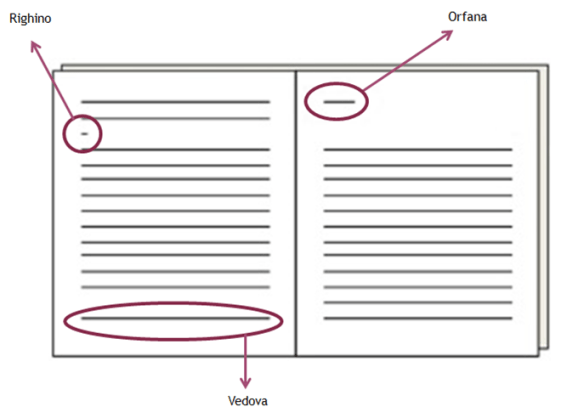 Vedova: riga di testo iniziale di un paragrafo che si trova isolata a fine pagina.