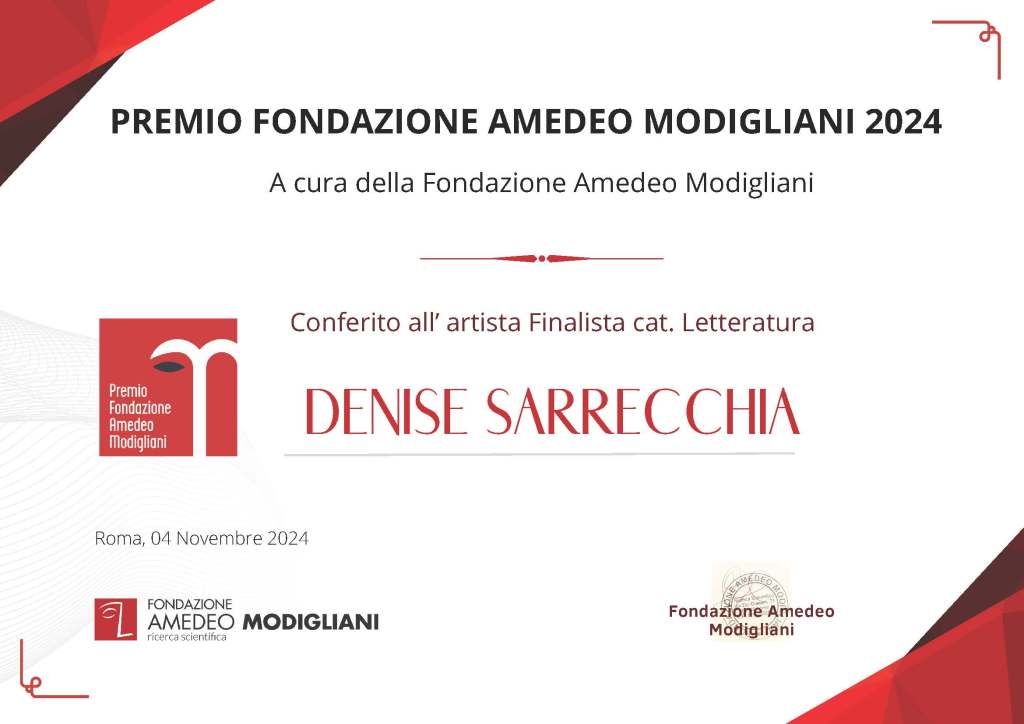 Giovedì 23 gennaio 2025, alle ore 17:30 a Roma, si è svolta la cerimonia di premiazione del Premio Fondazione Amedeo Modigliani, alla quale sono stata invitata come finalista della sezione letteraria con il mio romanzo inedito L’orso e la falena, che ha raggiunto, appunto, la fase finale del concorso.